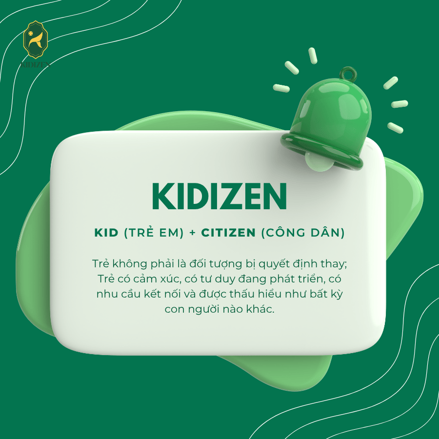 Tên gọi Kidizen được cấu thành từ hai từ: Kid (Trẻ em) và Citizen (Công dân). Điều này không chỉ là dấu ấn thương hiệu, mà là tuyên ngôn về cách Kidizen nhìn nhận Trẻ. Trẻ không phải là đối tượng bị quyết định thay; Trẻ có cảm xúc, có tư duy đang phát triển, có nhu cầu kết nối và được thấu hiểu như bất kỳ con người nào khác.