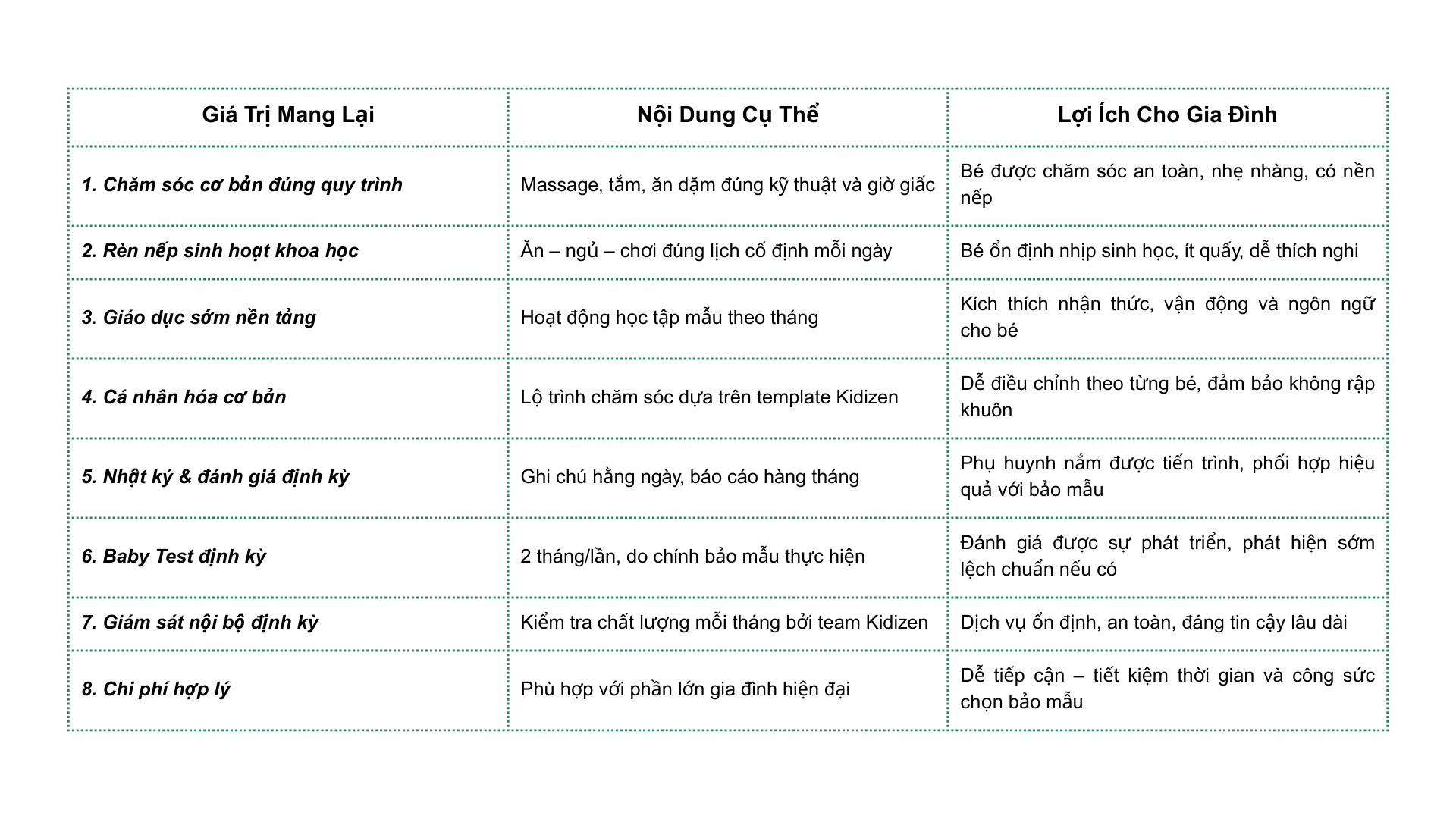 Hệ thống đào tạo và giám sát bảo mẫu theo tiêu chuẩn bản quyền riêng của Kidizen