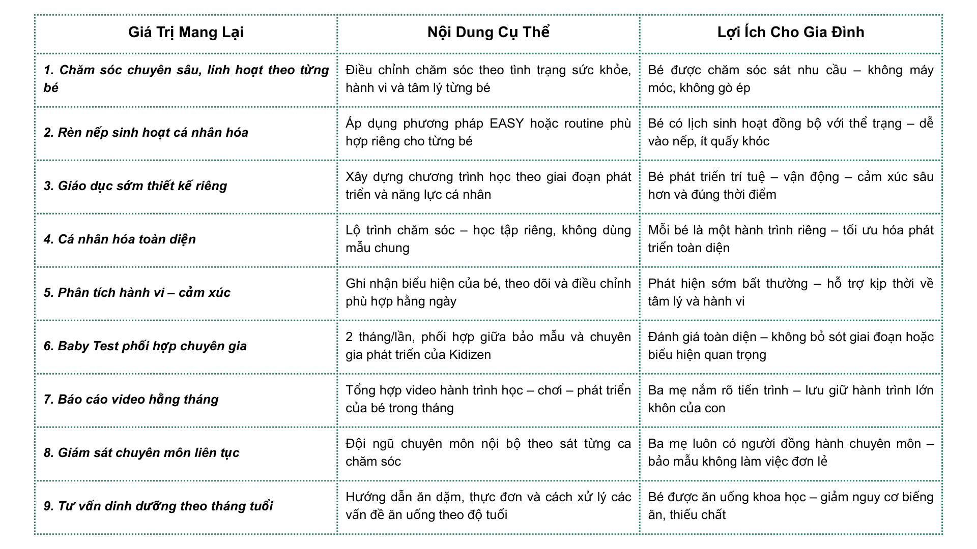 Cam kết mức độ chăm sóc – giáo dục – theo dõi chuyên sâu vượt trội hơn hẳn các dịch vụ bảo mẫu thông thường