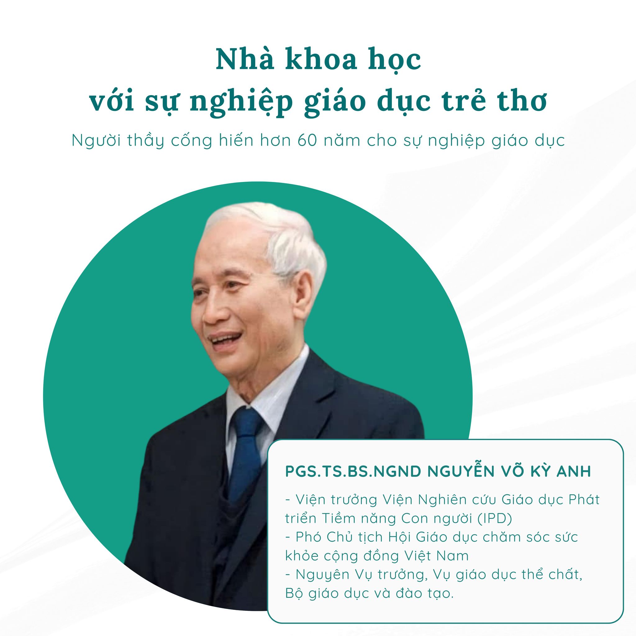 PGS.TS.BS.NGND Nguyễn Võ Kỳ Anh, Viện trưởng Viện Nghiên cứu Giáo dục Phát triển Tiềm năng Con người (IPD), là một trong những người thầy, người lãnh đạo có tầm ảnh hưởng lớn nhất trong lĩnh vực giáo dục tại Việt Nam. Với hơn 60 năm kinh nghiệm, ông đã có những đóng góp to lớn cho ngành giáo dục và phát triển tiềm năng trẻ em. Đặc biệt, ông là người tiên phong trong việc nghiên cứu giáo dục sớm, đặc biệt là thai giáo và phát triển trí tuệ cho trẻ từ khi còn trong bụng mẹ.